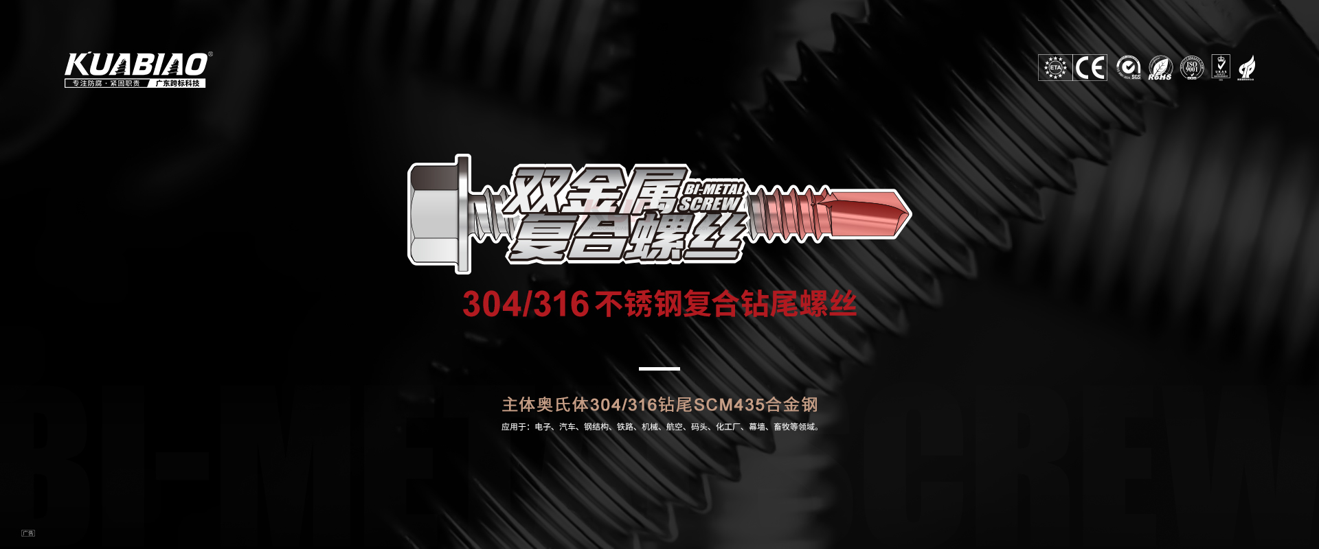 廣東跨標建筑科技有限公司原(東莞市跨標不銹鋼緊固件有限公司)成立于2005年。專注于高品質碳鋼、不銹鋼緊固件的生產及銷售;公司又于2013年成立雙金屬復合螺絲生產車間,是國內雙金屬復合螺絲的專業生產企業。主要生產復合螺絲,涂層螺絲(澳洲標準),不銹鋼螺絲,螺栓,不銹鋼鉚釘。